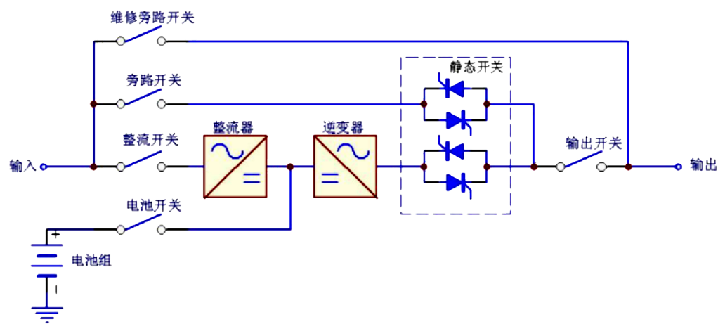 在失電情況下,UPS提供后備電源,并進(jìn)行必要的隔離和濾波,防止外部電壓波動對設(shè)備運(yùn)行的干擾。通常情況下,UPS通過逆變器輸出380V交流電源供應(yīng)負(fù)載,或市電異常情況下UPS把直流電轉(zhuǎn)變成交流電輸出,繼續(xù)提供負(fù)載運(yùn)行,不受斷電的困擾。在由于過載或者溫度過高以及逆變器發(fā)生損壞的情況下,UPS將自動無間斷的切換到旁路繼續(xù)供應(yīng)負(fù)載。